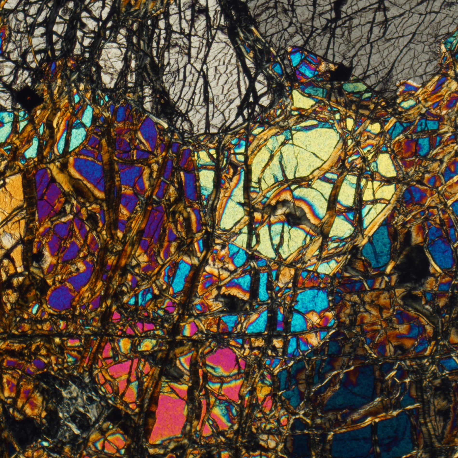 Das Bild (XPL, 25fache Vergrößerung) zeigt Olivine mit fortgeschrittener Serpentinisierung.