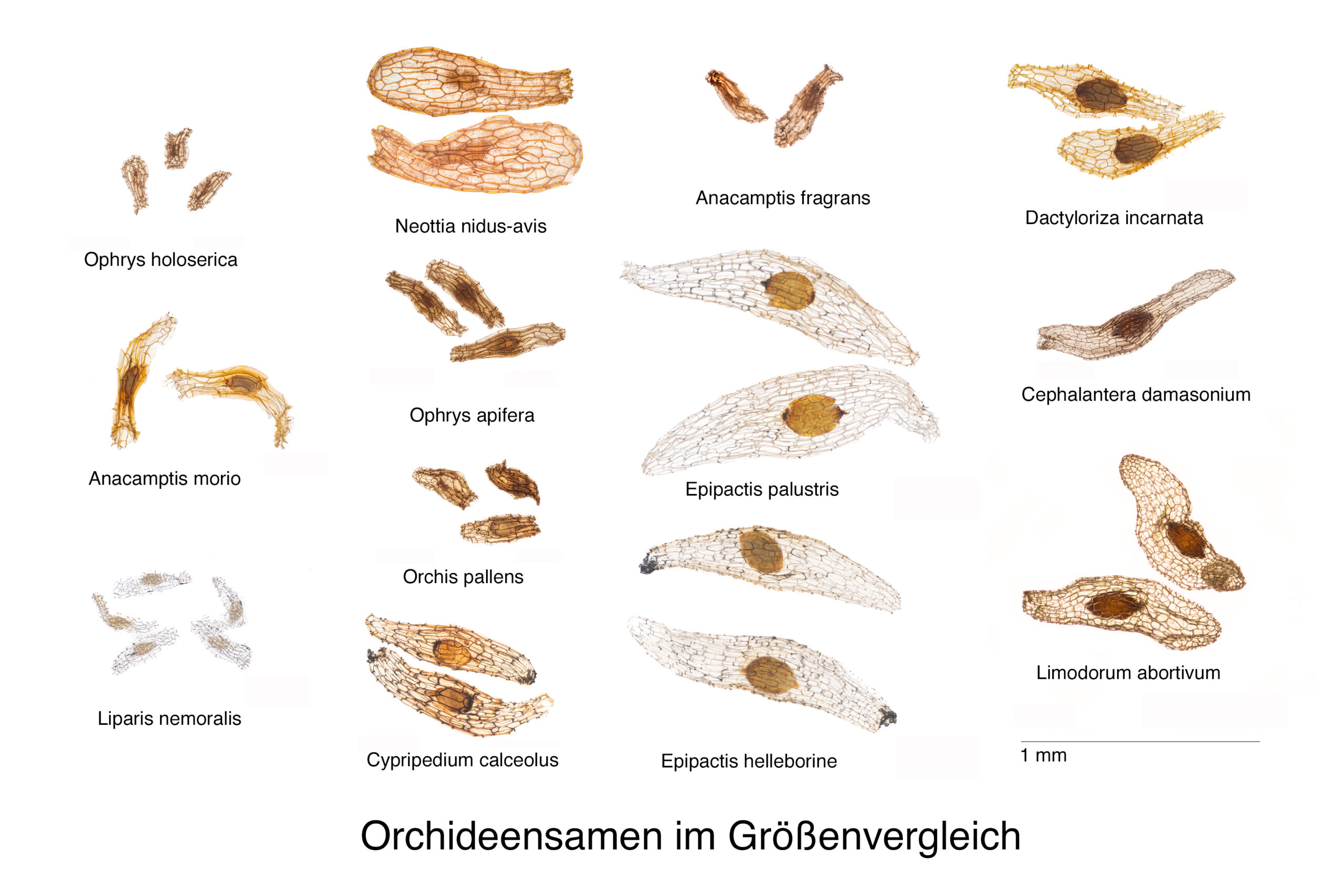 Die heimischen Orchideen zeigen ein sehr vielfältiges Aussehen, wodurch die verschiedenen Arten mehr oder weniger leicht zu unterscheiden sind. Die Farben und Formen der Blüten und Blütenstände ermöglichen dem interessierten Naturliebhaber, die einzelnen Arten zu bestimmen – bei einigen Arten ist es aber selbst für Spezialisten nicht so einfach. Uns hat interessiert, ob auch die Samen dieser Pflanzen unterschiedlich aussehen und das Aussehen „artspezifisch“ ist. Dazu haben wir von einigen Orchideenfreunden definitiv bestimmte Samen erhalten, die wir dann unter dem Mikroskop fotografiert haben.