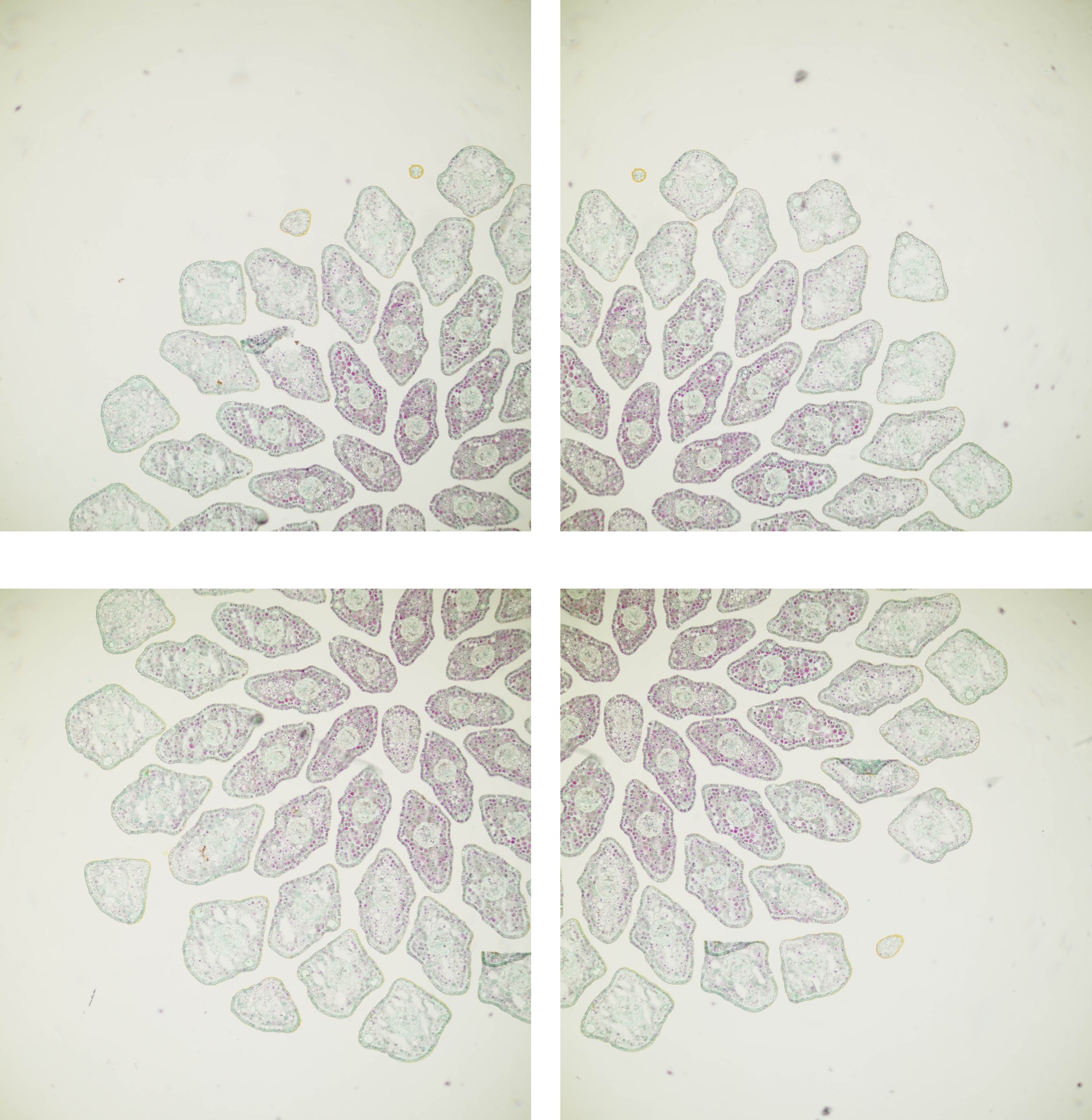 Abbildung 3-1: Einzelaufnahmen für ein 2×2-Panorama. Objekt war ein Fichtentrieb, der als Paraffinschnitt (8µm Schnittdicke) mit Hamburger Grün [8] eingefärbt wurde. Die Einzelaufnahmen sind mit einem 5x-Objektiv (NA 0,15) aufgenommen worden.